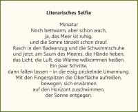 Was ist ein „Literarischen Selfie“? Gertie Wagerer weiß mehr darüber zu berichten: „Sicher kennen Sie auch diese Momente, in denen alles stimmt – innen und außen. Gipfelerlebnisse nannte es Abraham Maslow. Manchmal fallen sie mit bedeutsamen biografischen Ereignissen zusammen: jemand hält um Ihre Hand an, die Prüfung ist geschafft, der Berg bezwungen. Es können aber auch scheinbar ganz unbedeutende Gelegenheiten sein, bei denen jemand wie ich, der gerne fotografiert, die Kamera zücken möchte und zugleich weiß, das Wesentliche kann das Bild nicht festhalten: das Schwingen in der Bauchgegend, den Duft der Föhren, die Gedankenblitze im wohlig-förderlichen Gespräch. Da kam mir die Idee, das doch schreibend festzuhalten und ich nenne diese Momentaufnahmen: „literarische Selfies“. Weiterlesen ...