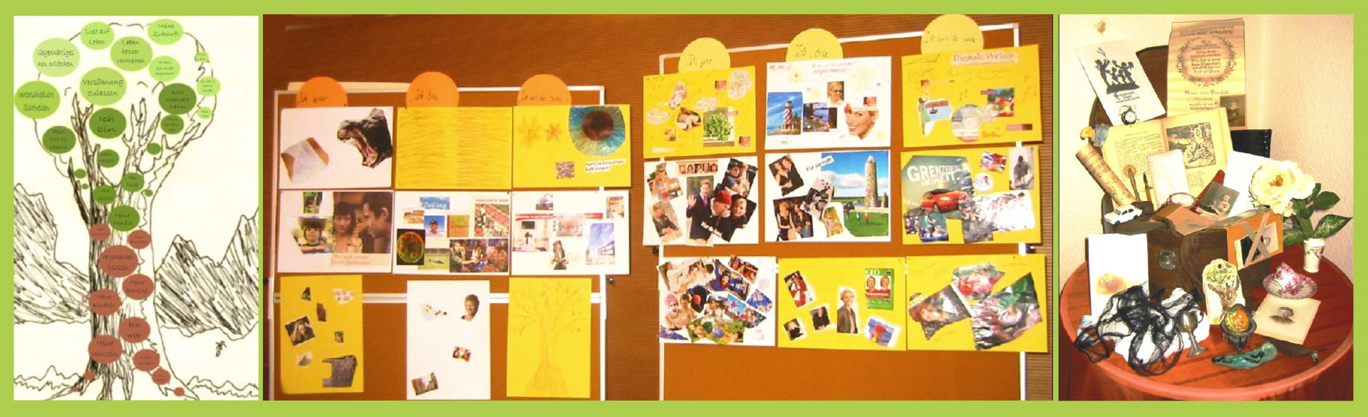 Möglich ist auch die Gestaltung dreier Collagen zum Thema Ich war, ich bin, ich werde sein - einer Phantasiereise, die darauf hinzielt, das eigene Leben mit allen bisherigen Tiefen und Höhen anzunehmen, eine Rückschau und Selbstvergewisserung, eine Arbeit an der eigenen Identität ... *